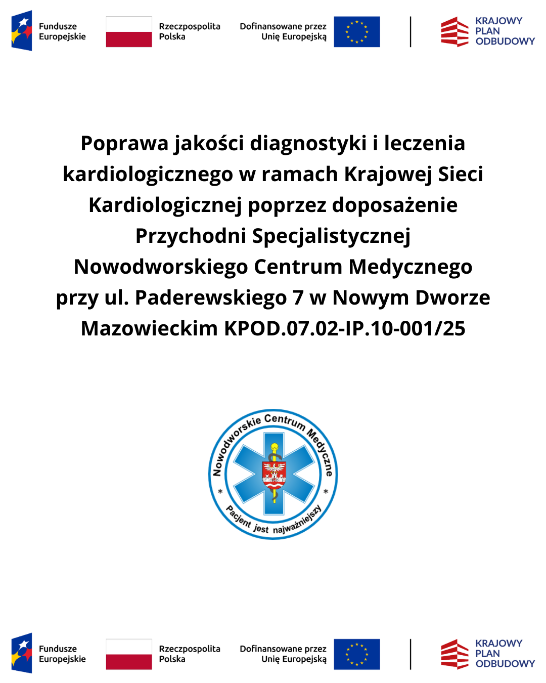 Poprawa jakości diagnostyki i leczenia kardiologicznego w ramach Krajowej Sieci Kardiologicznej poprzez doposażenie Przychodni Specjalistycznej Nowodworskiego Centrum Medycznego przy ul. Paderewskiego 7 w Nowym Dworze Mazowieckim (KPOD.07.02-IP.10-001/25).
