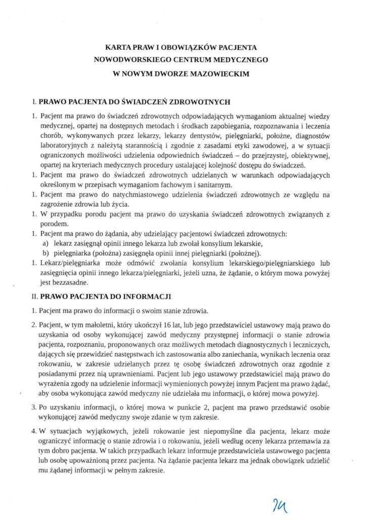 W celu zapewnienia pacjentom czytelnych informacji o ich prawach i obowiązkach oraz podniesienia standardu opieki i bezpieczeństwa w Nowodworskim Centrum Medycznym wprowadzono Kartę Praw i Obowiązków Pacjenta.